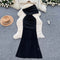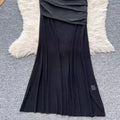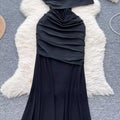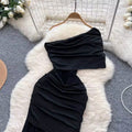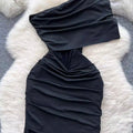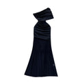 Slant Neckline Pleated Black Dress